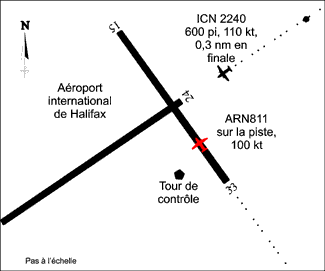 Pendant un vol selon les règles de vol aux instruments (IFR) entre Sydney et Halifax, ARN 811 a contacté le contrôleur d'aéroport de Halifax. Il a été mis au courant de la séquence d'approche vers la piste 33; on lui a donné les renseignements sur l'atterrissage et on lui a signalé le fait qu'il devrait sans doute se tenir à l'écart de la piste 24 après l'atterrissage. L'équipage a accusé réception de cette information. Peu après, le contrôleur a autorisé ARN 811 à se poser sur la piste 33, lui a demandé de rester à l'écart de la piste 24 et lui a indiqué qu'un autre avion se poserait simultanément sur la piste 24.