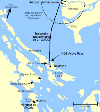 À 6 h 26, l'avion a quitté la zone de contrôle de Vancouver et est entré dans l'espace aérien contrôlé de classe E. Il n'existe aucune exigence spéciale pour les avions VFR évoluant dans cet espace aérien, et rien n'oblige l'ATC à fournir des services spécifiques dans cet espace aérien. Au voisinage des îles Gulf, l'avion a amorcé une légère descente pour aller s'établir en palier à 900 pieds asl. À 6 h 32, l'avion, alors en palier à 900 pieds asl, est passé à 0,25 mille marin (nm) à l'ouest du radiophare non directionnel (NDB) d'Active Pass à une vitesse constante de 130 noeuds (vitesse sol).