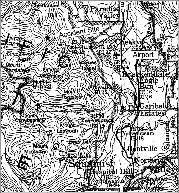 Les lieux de l'accident (49°47′48″ N, 123°14′36″ W) ne se trouvaient pas sur la route normale ou prévue entre l'aéroport de Squamish et le glacier, ou le lac Lovely Water, et il ne semblait n'y avoir aucune véritable attraction touristique dans le ravin. L'appareil a d'abord heurté un affleurement rocheux dans un ravin escarpé et étroit se trouvant dans une région montagneuse, au-dessous de la ligne de faîte des arbres, à quelque 3 800 pieds asl. Le relief immédiat était trop escarpé pour que les parties importantes de l'épave finissent leur course à cet endroit. Les parties les plus lourdes de l'épave ont donc dévalé la paroi rocheuse du ravin et se sont immobilisées à quelque 300 pieds en contrebas. Le fond du ravin mesure environ 300 pieds de largeur, mais là où s'est produit l'accident, l'ouverture du ravin mesure seulement quelque 100 pieds de large. L'hélicoptère a heurté une formation rocheuse faisant saillie à l'intérieur du ravin; de certains angles, les dimensions de l'affleurement rocheux sont difficiles à évaluer.
