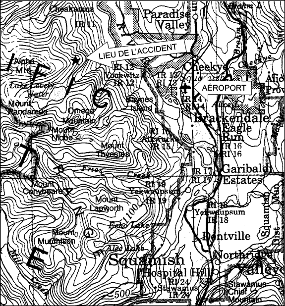 Le lendemain, à 16 h 48, l'épave de l'hélicoptère a été retrouvée à quelque trois milles marins à l'ouest de l'aéroport de Squamish et à environ un mille marin au nord-est du lac Lovely Water (voir l'annexe A). L'impact initial a eu lieu dans un ravin escarpé, à quelque 3 800 pieds au-dessus du niveau de la mer (asl). L'appareil a heurté le relief alors qu'il volait à basse vitesse. Il s'est disloqué et est tombé dans le ravin où il a fini sa course à quelque 300 pieds en contrebas du point d'impact initial. Le pilote et les passagers ont subi des blessures mortelles. Il n'y a pas eu d'incendie. L'heure de l'accident n'a pu être établie. La radiobalise de repérage d'urgence (ELT) a été détruite par le choc. Aucun signal d'ELT n'a été capté.