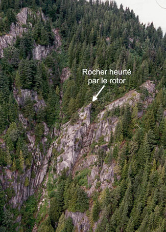 Les marques au sol relevées sur les lieux de l'accident et les dommages relevés sur les pales du rotor principal indiquent que les pales ont heurté un affleurement rocheux alors que l'hélicoptère manoeuvrait à basse vitesse, probablement en descente. Ces indices laissent également croire que l'impact initial a eu lieu du côté gauche pendant que l'appareil se déplaçait vers l'avant. Lors de l'impact initial, le rotor principal a subi des forces qui ont détruit l'ensemble rotor. L'hélicoptère est alors devenu ingouvernable. L'enquête n'ayant révélé aucun signe de défaillance ni de problème mécanique antérieur à l'accident, une analyse plus poussée a été faite sur l'aspect opérationnel du vol ayant mené à l'accident.