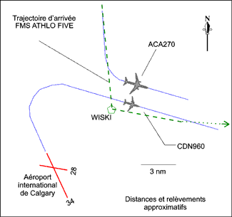 La piste 34 était utilisée pour les départs et la piste 28, pour les arrivées. Cette situation a donné lieu à des routes sécantes pour les appareils arrivant du nord et ceux décollant vers l'est. Pendant sa descente initiale vers Calgary, ACA270 a d'abord été autorisé à suivre la procédure d'arrivée FMS ATHLO FIVE par le contrôle terminal de Calgary qui l'a autorisé à descendre jusqu'à 12 000 pieds. Si cette procédure est suivie sans être modifiée par le contrôle de la circulation aérienne, l'appareil ne descend pas au-dessous de 10 000 pieds avant d'avoir dépassé le repère WISKI qui se trouve au sud de la région où est survenue la perte d'espacement.