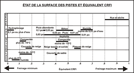 - Le tableau des équivalents du coefficient canadien de frottement sur piste (CRFI) n'indique aucune valeur pour les pistes contaminées par de la neige fondante. Les équipages de conduite n'ont aucun moyen d'évaluer facilement les effets de la neige fondante sur les performances de freinage d'un avion.