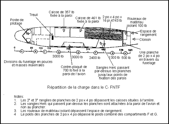 L'examen a permis de confirmer la répartition du fret et la méthode utilisée pour arrimer le fret transporté (voir l'annexe A). Le nez et le poste de pilotage ont été détruits à l'impact. Le fuselage s'est rompue sur toute sa circonférence, juste derrière le bord de fuite des ailes. Les deux caisses ne se sont pas déplacées. De plus, plusieurs feuilles de contre-plaqué sont restées en place en face du trou dans la paroi du fuselage. Le fuselage, à partir du bord de fuite des ailes, et la queue de l'appareil ont été tordus vers la gauche et vers le bas. Le reste des feuilles de contreplaqué est tombé dans le trou dans la paroi du fuselage, derrière les ailes. Le fuselage présentait une seconde rupture presque complète sur toute sa circonférence, à un endroit situé entre la partie avant de la dérive et l'avant des deux attaches de fixation du stabilisateur. Toutes les planches de 2 x 4 ont été trouvées dans la partie arrière du fuselage, dont un grand nombre derrière la cloison arrière.