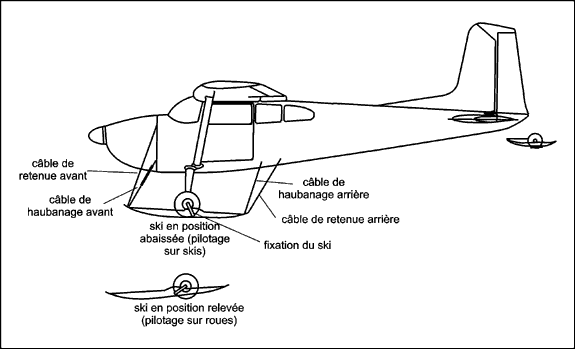 En vol, l'assiette des skis est maintenue grâce à un haubanage composé de câbles et de tendeurs. Des câbles métalliques toronnés de retenue sont également installés pour éviter une sur-extension ou une défaillance des câbles du haubanage. Un bon réglage de tous ces câbles est nécessaire pour maintenir les skis dans l'assiette voulue en vol, car les skis n'ont pas tendance à demeurer parallèles et horizontaux. Si, en vol, l'un des skis pique vers le haut ou vers le bas au-delà des limites prescrites, l'écoulement aérodynamique peut être perturbé et, dans les cas extrêmes, la traînée résultante peut empêcher l'appareil de poursuivre le vol en palier. Les instructions de haubanage sont fournies par le fabricant de skis et sont établies pour chaque type d'appareil sur lequel les skis sont installés. Les tendeurs avant, qui constituent une partie du haubanage, ont été soumis à des essais. Il a été établi que ces tendeurs étaient au moins trop vieux de cinq ans, mais leur âge exact n'a pas pu être déterminé. Des essais d'élongation ont été effectués afin de déterminer si les tendeurs respectaient les exigences de la norme MIL-C-5651. Cette norme spécifie la résistance à l'élongation dont doivent faire preuve les tendeurs au regard de diverses valeurs d'élongation. Ces essais ont révélé que la résistance des tendeurs des deux skis de l'appareil était inférieure de moitié à la résistance à l'élongation spécifiée dans la norme MIL-C-5651. Des câbles sur les skis maintiennent l'assiette des skis dans les limites définies par les câbles de retenue. En raison des dommages à l'appareil, on n'a pas pu établir la longueur des câbles du haubanage, ni si l'installation des câbles de retenue répondait aux spécifications applicables, ni si l'état des tendeurs avait pu faire osciller ou vibrer les skis. Toutefois, l'appareil n'avait connu aucun problème en exploitation hivernale depuis l'installation des skis en 1996, et cela sans que les câbles du haubanage n'aient jamais été changés. Par ailleurs, le rapport d'enquête no A97Q0032 du BST mettant en cause un Cessna 185F équipé de skis a établi que le non-respect de la consigne de navigabilité no CF-80-18, et peut-être le serrage incorrect d'un boulon, avait entraîné une défaillance en vol du ski et de la jambe du train d'atterrissage droit. L'article intitulé Dislocation en vol causée par une fixation de ski défectueuse, consacré à l'installation et aux problèmes d'entretien des skis, avait par la suite été publié dans le numéro 3/98 du bulletin Sécurité aérienne - Mainteneur de Transports Canada.