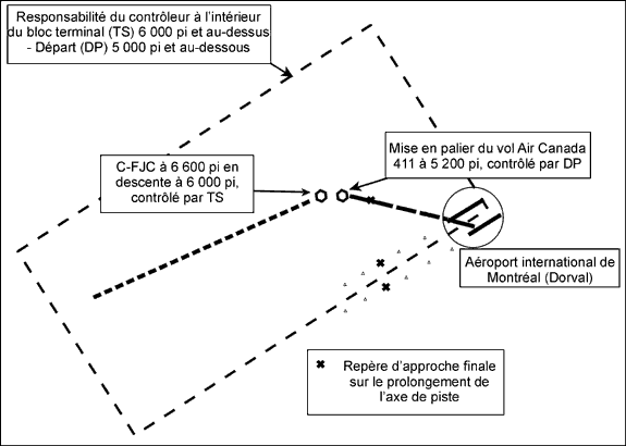 Le Cessna Citation 650, immatriculé C-FJJC, de Skyservice était en rapprochement de l'aéroport international de Montréal (Dorval) au Québec. Il effectuait un vol selon les règles de vol aux instruments en provenance de Toluca, au Mexique et il était en descente à 6 000 pieds. Le Boeing 767, immatriculé C-GAUP, effectuait le vol 411 d'Air Canada. Il avait décollé de la piste 28 de Dorval et se dirigeait vers Toronto (Ontario) en passant par Ottawa (Ontario) conformément à un plan de vol établi selon les règles de vol aux instruments. Il était en montée droit devant. Lors du contact initial avec le contrôleur des départs de Montréal, le Boeing 767 avait été autorisé à 17 000 pieds. Le pilote du Boeing 767 a interrompu sa montée à 5 200 pieds après avoir reçu un avis de circulation de son système de surveillance du trafic et d'évitement des collisions qui lui signalait la présence du Citation droit devant. Les deux avions sont passés à 1 400 pieds l'un de l'autre sur le plan vertical et à environ un quart de mille sur le plan horizontal.