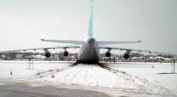 Vingt minutes avant l'atterrissage de l'AN124, les conditions de la piste étaient les suivantes : la partie centrale de la piste était recouverte à 90 % de neige folle et à 10 % de plaques de glace sur 120 pieds; sur les 40 pieds qui restaient, de part et d'autre de l'axe de piste, la piste était recouverte à 75 % d'un pouce de neige folle et à 25 % de plaques de glace. Quinze minutes avant l'atterrissage de l'AN124, un spécialiste de l'entretien aéroportuaire a effectué trois passages à différents endroits de la piste pour mesurer le CRFI. Il a été établi que l'indice moyen mesuré sur cette piste était de 0,30, mais cette information n'a pas été transmise à l'équipage de conduite de l'AN124. Cependant, trois minutes avant l'atterrissage, l'ATC a informé l'équipage de l'AN124 que la piste était recouverte de neige folle. Peu après l'incident, des membres de l'équipage ont inspecté la piste à pied et ont indiqué qu'elle était glissante. Après l'incident, il est tombé une petite neige légère.
