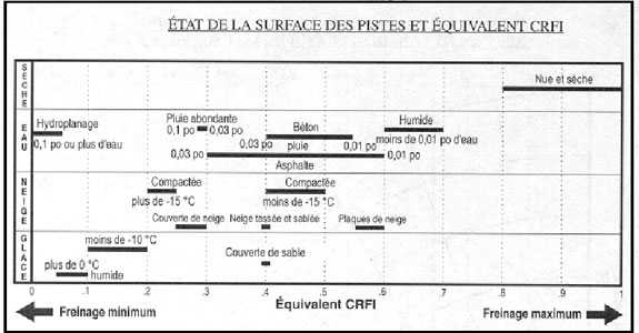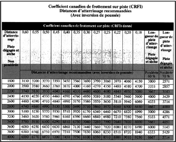 Lorsque le commandant de bord a utilisé les tableaux de performances pour calculer la distance d'atterrissage nécessaire, il a présumé que le freinage serait normal. Avec le point de toucher des roues à 984 pieds du seuil, le délai minimum pour abaisser le nez de l'avion, le déploiement des déporteurs, le déploiement des inverseurs de poussée et le maintien du freinage antidérapant maximal jusqu'à l'immobilisation de l'appareil, la distance d'atterrissage pondérée calculée était de 6 890 pieds. Même si l'appareil a effectué un atterrissage long, d'après les calculs du commandant de bord pour un atterrissage sur une piste dégagée et sèche, l'appareil aurait dû pouvoir s'immobiliser sur la longueur de piste disponible car la distance d'arrêt non pondérée était de 3 280 pieds. Cependant, d'après le tableau 2 des CRFI (figure 2), la distance d'atterrissage non pondérée de 4 125 pieds (distance d'atterrissage pondérée calculée de 6 890 pieds divisée par 1,67) est plus que doublée avec un CRFI de 0,30; la distance passe à environ 8 350 pieds.