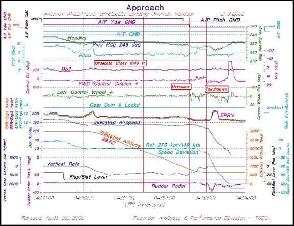 L'approche ILS a été effectuée avec les volets à 30° (pleins volets) et les becs de bord d'attaque à 17°. La vitesse normale pour l'approche est de 145 noeuds. L'équipage de conduite avait l'intention de voler à 148 noeuds pendant l'approche. La vitesse de 148 noeuds a été réglée au moyen d'un « curseur » sur l'anémomètre des pilotes, mais l'approche finale a été effectuée à la vitesse indiquée de 151 noeuds. La plupart du temps, entre la hauteur de décision et le franchissement du seuil, la vitesse d'approche a été supérieure à la vitesse normale de 145 noeuds.