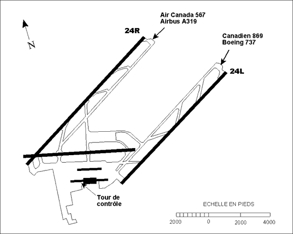 L'appareil du vol 869 de Canadien se trouvait sur la plate-forme d'attente de la piste 24L. Il était peint dans la nouvelle livrée des Lignes aériennes Canadien. De loin, cette livrée ressemble à celle d'Air Canada. (La tour de contrôle de l'aéroport se trouve à quelque deux milles de la plate-forme d'attente de la piste 24L.) Le contrôleur d'aéroport a vu un appareil sur la plate-forme de la piste 24L, là où il s'attendait à voir ACA567. Après plusieurs transmissions, le contrôleur a autorisé ACA567 à s'aligner sur la piste 24L en réponse à l'appel dans lequel il disait qu'il était « avec lui ». ACA567 a accusé réception de l'autorisation, mais il n'a pas répété le numéro de la piste assignée, comme l'exige le manuel d'exploitation d'Air Canada.