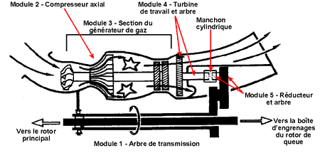 Le moteur est un assemblage de cinq grands modules (figure 1). Environ 37 heures avant l'accident, les modules 2, 3 et 5 avaient été remplacés par des modules révisés provenant du motoriste. Le module 4, c'est-à-dire la section de la turbine (libre) de travail, totalisait environ 1 200 heures de fonctionnement depuis la dernière révision.