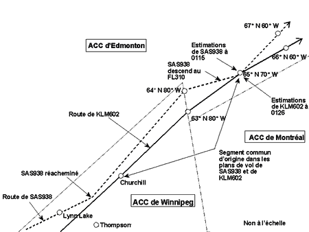 Au moment où les deux appareils s'approchent du segment de route commun près de Churchill, où le contrôle radar passe au contrôle non-radar, ils se voient attribuer le niveau de vol (FL) 330 et une vitesse de Mach 0,82. Cette mesure aurait garanti plus que la norme d'espacement non-radar requise de 10 minutes. Avant que le SAS938 atteigne Churchill, le contrôleur TL le réachemine au nord de la route prévue au plan de vol pour éviter un risque de conflit avec l'autre appareil. Le SAS938 devait revenir sur sa route d'origine prévue au plan de vol à 65° de latitude nord et 70° de longitude ouest. Le contrôle du SAS938 et, par la suite, du KLM602 est transféré au contrôleur du secteur de Nunavut (NU) de l'ACC d'Edmonton; toutefois, le réacheminement du SAS938 n'est pas communiqué. Lorsque le SAS938 se signale à 64° nord et 80° ouest, et non à 63° nord et 80° ouest, comme prévu sur le plan de vol, le contrôleur NU se rend compte que la norme d'espacement non-radar de 10 minutes n'est plus que de 9 minutes. Sur la foi d'estimations provenant de l'avion, le KLM602 franchirait le point situé à 65° nord et 70° ouest environ 11 minutes après le SAS938. Le contrôleur NU fait descendre le SAS938 au FL310 pour rétablir l'espacement requis.