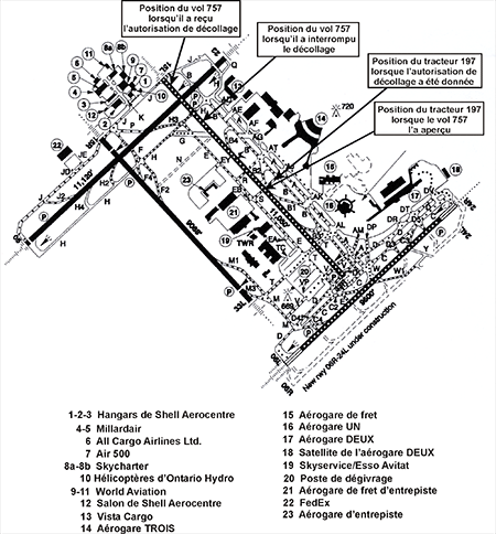 - Le contrôleur sol nord a autorisé par inadvertance le tracteur 197, qui remorquait un avion Airbus A310, à traverser la piste en service au moment où le contrôleur de la tour nord (un stagiaire) autorisait le vol 757 à décoller. L'autorisation délivrée par le contrôleur sol nord au tracteur 197 ne contenait aucune instruction explicite pour « traverser » une piste comme l'exige le Manuel d'exploitation du contrôle de la circulation aérienne (MANOPS ATC); de plus, le contrôleur sol nord n'avait pas coordonné le déplacement du tracteur 197 avec le contrôleur de la tour nord.