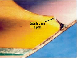 - Ce défaut au niveau du trou d'allégement a entraîné une crique de fatigue qui s'est propagée vers l'arrière sur le revêtement d'intrados jusqu'au bord de fuite puis, vers l'avant, sur le revêtement d'extrados en direction du longeron de la pale.