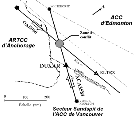 Le Bœing 737 d'Air Canada avait quitté Vancouver (Colombie-Britannique) pour un vol régulier (ACA3584) à destination de Whitehorse (Yukon). L'appareil était en croisière au niveau de vol (FL) 310 sous le contrôle du centre de contrôle régional (ACC) de Vancouver. Un DC-10 d'Omni Air Express (OAE960), volant vers le sud-est en provenance d'Anchorage (Alaska) et à destination de Cherry Point (Caroline du Nord) sous le contrôle de l'ACC d'Edmonton, avait reçu l'autorisation de monter du FL290 au FL330. Environ 10 minutes après que le B737 a franchi la limite séparant l'espace aérien de Vancouver et de celui d'Edmonton à l'intersection DUXAR, une perte d'espacement s'est produite dans l'espace aérien non radar lorsque le DC-10 s'est retrouvé en conflit, au FL310, avec le B737. Les deux appareils ont reçu un avertissement de leur système de surveillance du trafic et d'évitement des collisions : le DC-10 est descendu au FL290 et le B737 est monté au FL335 avant de revenir au FL310, une fois le conflit résolu.