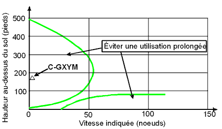 - L'hélicoptère était exploité de façon répétée en vol stationnaire à 165 pieds au-dessus du sol, ce qui le plaçait dans la zone « Éviter une utilisation prolongée » de la courbe vitesse/altitude. Dans cette zone, les chances de réussite d'un atterrissage d'urgence, en cas de perte de puissance du moteur, sont très minces.