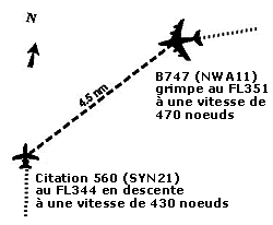 Peu après, le contrôleur no 3 a accepté le transfert du NWA11, puis du SYN21. Les deux appareils se sont rapportés au contrôleur no 3 en utilisant leur indicatif d'appel et en spécifiant clairement leur altitude, soit le FL350. Le contrôleur no 3 n'a pas collationné les altitudes pas plus qu'il n'a coché la case de l'altitude sur les FPV. À 14 h 09 (voir figure 1), le SYN21 a signalé au contrôleur no 3 que son système de surveillance du trafic et d'évitement des collisions (TCAS) lui indiquait qu'un appareil qui se trouvait à environ 8 NM convergeait vers lui à la même altitude. Le contrôleur no 3 a ordonné au SYN21 d'effectuer une descente d'urgence au FL330 et au NWA11 d'effectuer un virage de 90° vers la droite. Le volume du trafic à ce moment et juste avant la perte d'espacement était qualifié de léger, et la charge de travail de légère à modérée.