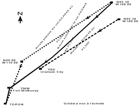 Le vol ACA845 a progressé du point 6530N100W directement vers TORON conformément à son autorisation. Le vol BAW49 se trouvait sur une trajectoire convergente du point 6430N100W jusqu'à Uranium City (YBE) (Saskatchewan). Les deux avions se sont observés visuellement et à l'aide du TCAS. L'équipage de conduite du vol ACA845 a contacté directement le vol BAW49 parce que l'avion se trouvait hors de portée par radio VHF du secteur Franklin, et il était évident que les trajectoires des deux appareils allaient se croiser. Le vol ACA845 a suivi une route parallèle à celle du vol BAW49 pendant environ cinq minutes jusqu'à ce qu'il soit en mesure de contacter directement le contrôleur du secteur Bison sur la fréquence VHF assignée.