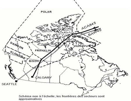 La spécialité de l'espace aérien supérieur du Nord du Centre de contrôle régional (ACC) d'Edmonton comprend cinq secteurs dans lesquels on applique les normes d'espacement non radar (basées sur les procédures) et un secteur (Bison) qui assure à la fois des contrôles radar et non radar (voir l'annexe B). On assure l'espacement des aéronefs dans les zones de contrôle non radar en assignant à chaque aéronef des routes et des altitudes spécifiques à suivre. La confirmation de l'espacement se fait au moyen de comptes rendus de position périodiques, qui sont généralement transmis par les équipages de conduite à tous les 10 degrés de longitude ou à la verticale des points de compte rendu obligatoires. Selon l'endroit où l'aéronef se trouve, les contrôleurs peuvent recevoir ces rapports de deux façons différentes. Dans le Grand Nord, les rapports sont acheminés à l'aide d'installations radio télécommandées (RCO) à très haute fréquence (VHF) ou à haute fréquence (HF) aux spécialistes de la radio Arctique basés à North Bay (Ontario). L'information est ensuite relayée aux contrôleurs d'Edmonton par lignes téléphoniques terrestres. Plus au sud, les équipages de conduite fournissent leurs comptes rendus de position par l'intermédiaire de RCO VHF qui sont directement accessibles par les contrôleurs d'Edmonton.