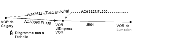 Il s'est produit une perte d'espacement entre deux avions à proximité du VOR (radiophare omnidirectionnel à très haute fréquence) d'Empress. Le Boeing 737-200 du vol 3696 d'Air Canada (ACA3696) avait décollé de Calgary (Alberta) et faisait route vers l'est à destination de Winnipeg (Manitoba) au niveau de vol (FL) 330 et il se dirigeait vers le VOR d'Empress. Le Boeing 737-200 du vol 3627 d'Air Canada (ACA3627) avait décollé de Winnipeg et faisait route vers l'ouest à destination de Vancouver (Colombie-Britannique) au FL330 lorsqu'il a dû dévier au nord de la route prévue en raison du mauvais temps. Les deux avions se trouvaient près du VOR d'Empress lorsque ACA3627 a reçu l'autorisation de se diriger, dès qu'il le pourrait, vers le VOR de Calgary. ACA3627 a accusé réception de l'autorisation, mais il a viré vers le VOR d'Empress, qui n'était pas sur la route vers Calgary. Environ quatre minutes plus tard, le contrôleur du secteur Alsask a avisé ACA3627 de virer à droite pour éviter un aéronef. L'équipage d'ACA3627 a répondu et il a annoncé qu'il descendait conformément à un avis de résolution (RA) que lui donnait son système de surveillance du trafic et d'évitement des collisions (TCAS). Au même moment, l'équipage de conduite d'ACA3696, qui avait vu ACA3627 qui se rapprochait de la gauche au même niveau de vol, a amorcé un léger virage vers la droite, puis il a reçu de son TCAS un RA de grimper. Plutôt que de grimper, l'équipage d'ACA3696 a augmenté l'angle d'inclinaison de son virage jusqu'à 45 degrés et l'avion a subi des tremblements. Pour contrer ces tremblements, l'équipage a amorcé une descente et il a avisé le contrôle de la circulation aérienne (ATC) qu'il descendait en réponse à un RA du TCAS. L'équipage de conduite a interrompu la descente après 300 pieds, a remis les ailes de niveau et a remonté jusqu'au FL330. Au cours de la manœuvre, un agent de bord et deux passagers ont été légèrement blessés.