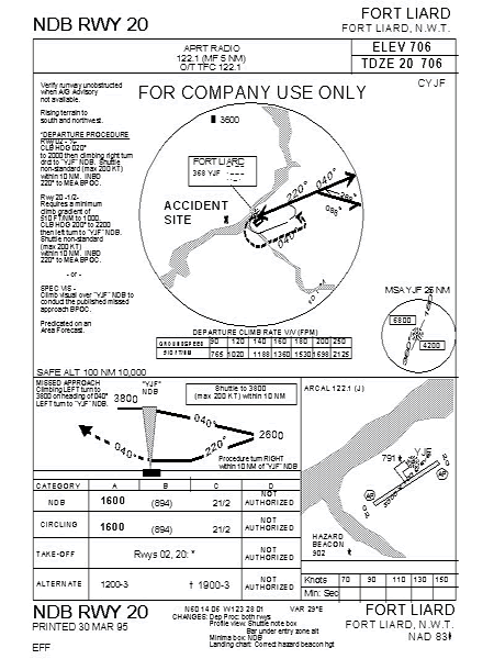L'aéroport de Fort Liard ne possède qu'une seule approche aux instruments, à savoir l'approche NDB de la piste 20, qui est réservée au seul usage de la compagnie (voir l'annexe A). Une approche aux instruments de la piste 02 oblige à recourir à une procédure d'approche indirecte. L'altitude minimale de descente de cette approche indirecte est de 894 pieds au-dessus de l'altitude de l'aérodrome, et la visibilité obligatoire est de 2½ milles terrestres dans le cas d'un aéronef évoluant jusqu'à une vitesse de 140 nœuds. Le NDB était en état de marche au moment de l'accident.