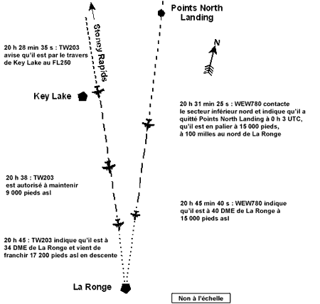 Environ deux minutes plus tard, TW203 a demandé l'autorisation de descendre, et le troisième contrôleur l'a autorisé à descendre à 9 000 pieds au-dessus du niveau de la mer (asl). Cette autorisation permettait à TW203 de franchir en descente l'altitude de WEW780. À ce moment, le contrôleur des données (le deuxième contrôleur) a demandé au contrôleur radar (le troisième contrôleur) de demander à WEW780 son ETA à La Ronge. À 20 h 39 min 15 s, le pilote de WEW780 a répondu qu'il pensait arriver à La Ronge dans 15 minutes. Le contrôleur des données a alors corrigé l'ETA et a inscrit 20 h 55 sur la fiche d'arrivée de WEW780, mais il n'a pas changé la fiche de place dans le râtelier de La Ronge pour la mettre dans l'ordre chronologique des arrivées à La Ronge. Aucun des deux contrôleurs n'avait encore décelé le conflit entre les deux appareils à ce moment.