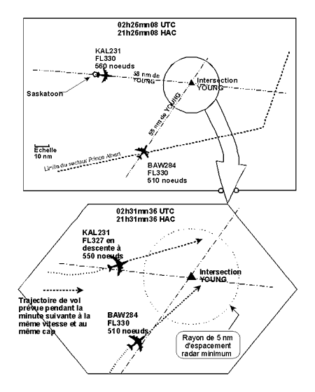 Le Boeing 747-200 de Korean Airlines (KAL231) effectue un vol entre Anchorage (Alaska) et Chicago (Illinois). Le Boeing 747-400 de British Airways (BAW284) effectue un vol entre San Francisco (Californie) et Londres, en Angleterre. Les deux appareils se trouvent au niveau de vol (FL) 330 et leurs trajectoires de vol prévues vont se croiser à environ 63 milles marins (nm) à l'est de Saskatoon (Saskatchewan). Ils sont censés atteindre le point d'intersection quasiment en même temps. Vers 21 h 30, heure locale, alors que les avions se trouvent tous les deux à environ 10 nm du point d'intersection, le contrôleur du secteur de Prince Albert se rend compte qu'un conflit est imminent. Le contrôleur de Prince Albert demande à KAL231 son cap et lui ordonne de virer à gauche et de descendre au FL310. Après que l'équipage de KAL231 accuse réception des instructions, le contrôleur demande à BAW284 son cap, puis lui ordonne de virer à droite immédiatement. L'équipage de KAL231 demande ensuite des précisions sur les instructions de descente et reçoit l'ordre de descendre immédiatement. Les équipages des deux appareils se conforment alors aux instructions. L'espacement minimal entre les deux appareils au cours des manoeuvres a été réduit à presque 7,9 nm sur le plan horizontal et à 700 pieds sur le plan vertical. L'espacement obligatoire de 5 nm a été respecté, mais il n'y a pas eu d'espacement prévu entre KAL231 et BAW284, et la sécurité n'a pas été assurée durant l'incident.