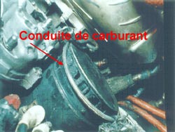 - Du fait qu'elle était coincée contre le démarreur/alternateur en vibration, la conduite de carburant s'est usée et a fini par se rompre, ce qui a permis à du carburant de pénétrer dans le démarreur/alternateur, causant un incendie.