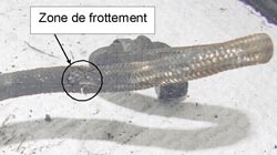 Un examen plus poussé de la conduite de carburant coincée a révélé que sa gaine en acier tressé et son revêtement intérieur étaient perforés (voir la photo 2). Sur trois hélicoptères similaires, les deux conduites en provenance du VIGVA passaient derrière et sous le démarreur/alternateur, sans être gênées dans leur parcours.