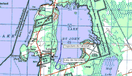 Le lac St. John mesure environ 3,4 kilomètres de longueur sur 2 kilomètres de largeur et il est orienté selon un axe nord/sud (voir l'annexe A). L'hydrobase d'Orillia Aviation Limited est située dans une baie du côté sud-est du lac. À l'extrémité sud du lac, à l'endroit où l'accident s'est produit, il y a une zone littorale marécageuse d'environ 300 à 500 mètres qui s'étend au sud de la limite des arbres marquant le début d'une région boisée. Les arbres à cet endroit mesurent de 20 à 30 pieds de hauteur.