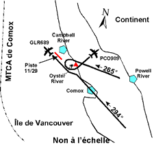 Vers 8 h, heure locale, le Shorts SD3-60, immatriculé C-GPCJ, exploité par Pacific Coastal Airlines sous l'indicatif PCO909, et le Beechcraft 1900D, immatriculé C-FCMR, exploité par Central Mountain Air sous l'indicatif GLR689, assurent tous les deux un vol régulier entre Vancouver et Campbell River (Colombie-Britannique). PCO909 est exploité selon les règles de vol à vue (VFR) et doit se poser sur la piste 29. GLR689 est exploité selon les règles de vol aux instruments (IFR) et a reçu du contrôleur terminal de Comox l'autorisation d'effectuer une approche LOC(BC)/DME directe sur la piste 29. Les équipages de conduite des deux appareils sont en contact radio avec la station d'information de vol (FSS) de Campbell River sur la fréquence obligatoire (MF). PCO909 s'annonce en étape de base du circuit à droite comme arrivant le premier, mais une fois sur la côte, il rencontre des conditions météorologiques inférieures aux minima VFR. L'équipage interrompt son approche à vue en faisant un virage à gauche et monte vers l'est. GLR689 reçoit alors un avis de résolution (RA) de son système de surveillance du trafic et d'évitement des collisions (TCAS) et effectue une approche interrompue avec une manoeuvre d'évitement vers la gauche. Les deux appareils se sont retrouvés à proximité l'un de l'autre alors qu'ils étaient en montée mais dans des directions opposées. Les deux équipages entrent ensuite en contact avec la tour de Comox pour obtenir des vecteurs pour une approche IFR et atterrissent à Campbell River sans autre incident.