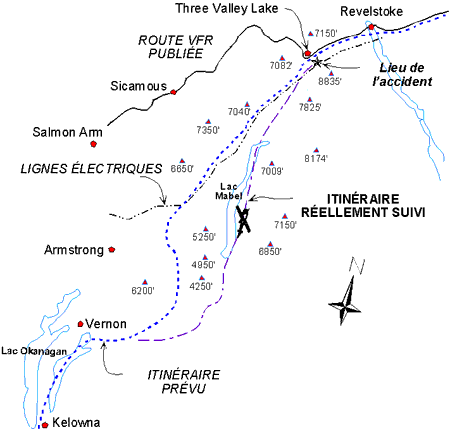 L'hélicoptère, exploité par la compagnie Northern Air Support Limited basée à Kelowna, était convoyé à Rocky Mountain House. Après avoir quitté l'aéroport de Kelowna l'après-midi de l'accident, l'hélicoptère a volé vers le nord-est à travers la vallée du lac Mabel, à environ 45 milles marins au nord-est de Kelowna, avant de suivre les lignes électriques allant vers Revelstoke (voir la figure 1). Cet itinéraire ne correspondait pas à celui initialement prévu lors de l'exposé avant vol à Kelowna. Il n'a pas été possible d'établir pourquoi le pilote avait choisi de s'écarter de l'itinéraire initialement prévu. Les conditions météorologiques qui prévalaient dans la région de Silver Star au cours des heures ayant précédé l'accident, n'empêchaient en rien de suivre l'itinéraire prévu.
