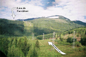 Pour cette raison, le pilote de C-FAHS a abandonné l'itinéraire direct survolant les lignes électriques jusqu'à Revelstoke et a suivi, sans rencontrer de difficulté, la route VFR qui suit le chemin qui traverse Three Valley Gap. Le lieu de l'accident se trouvait sur le segment de route qui suivait le cheminement ascendant des lignes électriques, à environ 100 mètres à l'ouest de ces dernières. Celles-ci, à cet endroit, suivent un axe approximatif 040/220°M (voir la photo 1). Le pilote de C-FAHS n'a pas rencontré de précipitations ou de conditions givrantes dans la région de Three Valley Gap. Il a noté que le sol, sur les hauteurs, à proximité des lignes électriques, était partiellement couvert de neige, mais il ne s'agissait pas d'une neige fraîchement tombée.