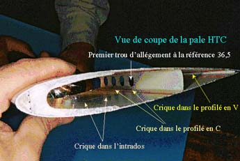 - La pale de rotor principal s'est criquée sous l'effet de la fatigue du métal, crique qui a pris naissance sur des piqûres ou imperfections relativement larges à la surface des trous d'allégement du profilé en C. Ces piqûres ont causé une zone de concentration des contraintes et sont le point de départ de la crique qui s'est propagée jusqu'à l'intrados de la pale.