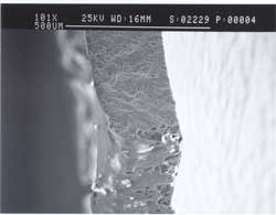On a découvert que l'amorce de crique de fatigue était associée à des piqûres de corrosion relativement grosses à la surface du trou d'allégement du profilé en C (photo 2). Ces piqûres étaient présentes lorsque la couche d'apprêt a été appliquée sur la pièce. Des bâtonnets de strontium, qui sont incorporés à l'apprêt, ont été trouvés à la surface des piqûres de corrosion. Une crique secondaire s'était propagée jusqu'à la partie inférieure du troisième trou d'allégement du profilé en C. La crique au niveau du troisième trou d'allégement du profilé en C semblait être associée à des piqûres dans la surface intérieure du trou d'allégement. D'après une analyse du revêtement de la pale et du profilé en C, le matériau utilisé est un alliage d'aluminium Alclad AA 2024. Aucun contaminant significatif n'a été retrouvé sur les faciès de rupture de la crique.