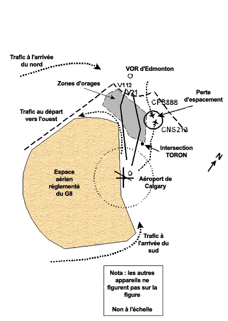 À 14 h 30, l'aéroport de Calgary a été fermé afin de protéger le départ d'avions de dignitaires du G-8. À 15 h 30, soit après que la plupart des avions de dignitaires étaient partis, le coordonnateur du contrôle terminal de Calgary a levé la fermeture et a mis en oeuvre une mesure de contrôle du trafic afin de contrôler les arrivées et les départs à l'aéroport de Calgary. Cette mesure comprenait un délai au sol de cinq minutes entre les départs des avions au départ d'Edmonton et à destination de Calgary, ainsi qu'une attente en vol visant le trafic à destination de Calgary. Juste avant l'événement, quatre avions se dirigeant vers le sud, dont CPB888, étaient en attente ou faisaient l'objet d'une préparation pour une attente de 20 minutes à l'extérieur du terminal de Calgary. Puisque l'intersection TORON n'était pas disponible comme repère d'attente en raison des conditions météorologiques, le contrôleur radar de Red Deer a dû établir des repères d'attente révisés. De plus, à la demande du terminal de Calgary, une fenêtre « 16/17 » était en vigueur, ce qui signifiait que le trafic à l'arrivée était généralement maintenu à une altitude de 17 000 pieds et plus et le trafic au départ était maintenu à une altitude de 16 000 pieds et moins. Le coordonnateur du G8 avait quitté la salle des opérations, et le superviseur du secteur de Red Deer occupait un poste de contrôle. Aucun d'eux n'était disponible pour répondre au contrôleur du secteur de Red Deer qui s'inquiétait du niveau de trafic qui augmentait, mais un gestionnaire de quart en service avait été assigné à la surveillance de la gestion du trafic associé aux activités du G8.