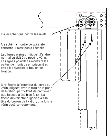 Lorsqu=une patte de fixation supérieure est placée correctement dans la structure de montage de la cellule, la géométrie du vérin permet de garantir que la seconde patte sera bien positionnée. Pendant la pose, si un axe de petit diamètre était inséré dans la structure de montage de l=une des pattes de fixation, cet axe pourrait supporter le poids du vérin pendant la pose d=un boulon à tolérance serrée dans l=autre patte de fixation. Ensuite, l=axe pourrait être enlevé afin de laisser sa place à un boulon à forte tolérance. De plus, si des flèches étaient apposées sur les côtés du vérin, dans l=alignement des trous des paliers sphériques (voir l=annexe A), il serait possible de déterminer facilement le bon positionnement du vérin. Aucun avertissement n=avait été publié pour indiquer de porter une attention toute spéciale à la pose des boulons de fixation du vérin, pas plus que des procédures n=étaient présentes pour garantir la bonne pose des boulons à forte tolérance.