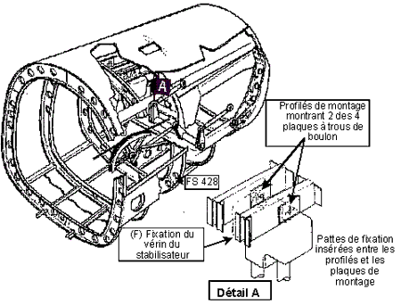 La structure qui permet de fixer le vérin du compensateur du stabilisateur à la cellule se compose de quatre ensembles profilé-plaque qui sont alignés en avant et en arrière tout en étant installés entre une lisse située à la référence 418.900 et une cloison étanche se trouvant à la référence 428.335, dans la section supérieure de l=empennage. Pour permettre la présence de trous dans lesquels des boulons de fixation à tolérance serrée sont installés, une plaque est rivetée à chaque profilé. Il y a deux pattes de fixation supérieures sur le vérin du compensateur du stabilisateur; ces deux pattes de fixation sont munies d=un palier sphérique. Pour permettre au vérin du compensateur d=être fixé à la structure supérieure de la cellule, un boulon distinct à grande tolérance est inséré dans les trous de chaque ensemble de deux profilés tout en passant à travers le palier sphérique de chacune des pattes de fixation. L=installateur est à genou, penché vers l=avant tout en tenant le vérin (qui pèse environ 10 livres) en place, au-dessus et en avant de lui. Les pattes de fixation sont masquées par leurs profilés respectifs, et les boulons sont posés au toucher. À n=importe quel moment pendant le processus, les paliers sphériques peuvent tourner légèrement, ce qui rend difficile l=insertion des boulons à tolérance serrée. La procédure normale consiste à insérer un boulon dans l=une des paires de profilés et dans la patte de fixation, puis à laisser le vérin suspendu de tout son poids contre la structure de fixation à la cellule (voir les figures 1 et 2).