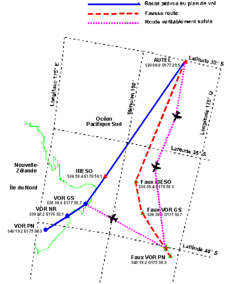 - Les six derniers points de cheminement du plan de vol entre Pago Pago et Palmerston North ont été entrés dans les deux GPS avec une longitude ouest plutôt qu'une longitude est, ce qui fait que le GPS a dirigé l'avion vers des positions situées à l'est du méridien 180°.