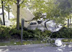 Dans sa tentative de rétablir la puissance du moteur, le pilote s'assure que la manette des gaz est réglée au maximum, il vérifie les réglages de la pompe d'amorçage et des magnétos, et il passe d'un réservoir à l'autre, mais tout cela sans aucun résultat. Le pilote met ensuite le réchauffage du carburateur en marche, il constate une perte encore plus grande de la puissance du moteur, et il coupe le réchauffage du carburateur. À ce point, le moteur ne produit pas assez de puissance pour maintenir le vol en palier et ramener l'avion jusqu'à l'aéroport, le pilote cherche donc un endroit propice à un atterrissage forcé. L'avion survole une zone densément peuplée, et le seul endroit dégagé convenable est entouré d'arbres et de bâtiments. Pendant l'approche finale, le moteur ne produit plus aucune puissance. Le pilote braque complètement les volets vers le bas, il survole la clairière et fait décrocher l'avion dans les arbres. L'appareil est lourdement endommagé et l'un des passagers est légèrement blessé.