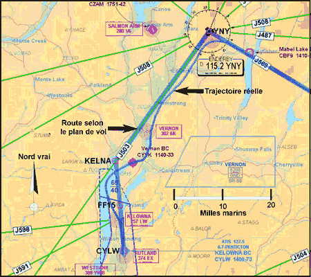 - L'aéroport de Vernon et sa fréquence de trafic d'aérodrome ne sont mentionnés dans aucune des cartes de Kelowna du Manuel de routes d'Air Canada. Si un équipage d'Air Canada devait se trouver sur le point d'empiéter sur la zone de cette fréquence, il serait dans l'impossibilité de trouver la fréquence sur laquelle il serait tenu de communiquer sa position et ses intentions.