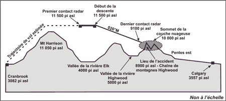 Le radar du contrôle de la circulation aérienne (ATC) a commencé à enregistrer l'avion immatriculé C-GVZE à 19 h 31, alors que ce dernier se trouvait à quelque 65 nm de Calgary, à l'ouest de la ligne continentale de partage des eaux. La première altitude enregistrée a été de 11 500 pieds asl et, à 19 h 33, une descente a été amorcée à partir de 11 400 pieds et s'est poursuivie à un taux relativement constant de 828 pieds par minute pendant le reste du vol. La descente a commencé au-dessus de la ligne continentale de partage des eaux et s'est poursuivie à l'est de cette dernière, au-dessus de chaînes de montagnes élevées, puis au-dessus de la chaîne de montagnes Highwood, à l'est de la vallée de Highwood.
