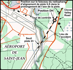 Le dernier message radio en provenance de l'avion a eu lieu lorsque ce dernier a été établi sur la trajectoire d'approche finale de la piste 23. Après l'impact, à 22 h 34 min 30, le spécialiste de la FSS a entendu un signal d'une durée de deux secondes émis par la radiobalise de repérage d'urgence (ELT). Vingt minutes plus tard, l'équipe d'un véhicule de lutte contre les incendies de l'aéroport a repéré l'avion à l'envers et en feu, à l'extrémité sud-est de Clover Valley Road, à environ un-demi mille marin du seuil de la piste 23, à 650 pieds au sud-est du prolongement de l'axe de la piste (figure 1). Les pilotes avaient déjà évacué l'avion en passant par la porte d'entrée de la cabine et ils s'étaient rendus à une propriété privée pour demander de l'aide; les deux membres d'équipage avaient subi de graves brûlures.