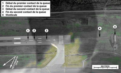 Les premiers dommages à l'aéronef sont survenus à la rotation lorsque la partie inférieure du fuselage arrière de l'avion est entré en contact avec la piste à deux reprises et que l'avion a poursuivi sa course au sol jusqu'à un point situé à 825 pieds au-delà de l'extrémité de la piste 24. L'avion a subi de lourds dommages lorsque la partie inférieure du fuselage arrière a percuté le monticule. La dérive et les deux stabilisateurs se sont alors détachés du fuselage. L'impact final s'est produit dans une zone boisée. Le violent incendie qui s'est déclaré après l'accident a détruit le reste de la structure en avant de la cloison étanche arrière de l'avion (Photo 1).