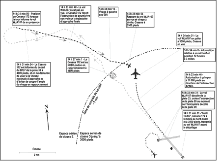 L'avion Boeing 737-200 assurant le vol WestJet 107 (WJA107) effectue un vol régulier entre London (Ontario) et Winnipeg (Manitoba). Le vol reçoit l'autorisation de décoller de la piste 33 selon un départ normalisé aux instruments London One qui requiert une montée sur le cap de piste jusqu'à 4000 pieds au-dessus du niveau de la mer (asl). Le contrôleur d'aéroport informe le vol WJA107 de la présence d'un aéronef en vol selon les règles de vol à vue (VFR) à environ 8 milles marins (nm) au nord-ouest, à une altitude de 3500 pieds asl. Le vol WJA107 décolle vers 14 h 33, heure avancée de l'Est, et contacte le centre de contrôle régional (ACC) de Toronto; de nouveau, on avise le vol WJA107 de la présence d'un appareil VFR. Le vol WJA107 reçoit ensuite un avis de circulation de son système de surveillance du trafic et d'évitement des collisions, suivi d'un avis de résolution de conflit lui demandant de surveiller sa vitesse verticale. L'avion se met en palier à 3000 pieds asl et, peu après, le contrôleur de l'ACC demande au vol WJA107 de demeurer à 3000 pieds. Le vol WJA107 établit le contact visuel avec l'aéronef en cause, un avion Cessna 172, au moment où les deux appareils se croisent. Les données du radar indiquent qu'à 14 h 34 min 53 les deux aéronefs se sont croisés avec un espacement latéral de 0,6 nm et un espacement vertical de 500 pieds.