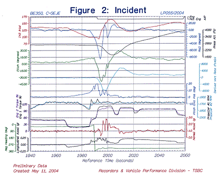 L'annexe B présente les courbes FDR correspondant au décrochage. Le FDR révèle que l'avion a volé en palier à 2700 pieds asl pendant environ deux minutes avant de décrocher. Après la mise en palier, la vitesse a diminué lentement jusqu'à environ 135 noeuds, puis elle est demeurée relativement constante dans les 30 secondes qui ont suivi. L'équipage a réduit la puissance, et le couple a diminué; il est passé de 48 % à 20 %, ce qui a rapidement fait chuter la vitesse à 98 noeuds dans les 14 secondes qui ont suivi. L'équipage a augmenté la puissance, et le couple a augmenté à environ 54 %. L'avion a alors amorcé un mouvement de roulis vers la gauche à un taux d'environ 5° par seconde. La vitesse est demeurée à 98 noeuds pendant plusieurs secondes, pendant que le taux de roulis augmentait à 15° par seconde et que la position de la commande de tangageNote de bas de page 5 augmentait à 20° avant le décrochage. Le pilote automatique est demeuré embrayé jusqu'au décrochage de l'avion.