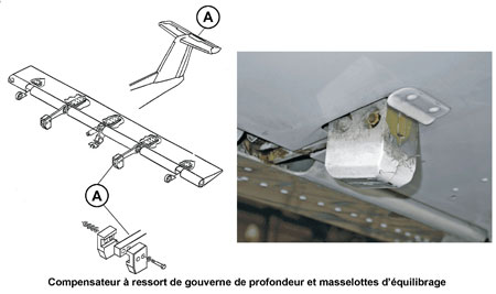 Le dispositif du compensateur à ressort de chaque profondeur est conçu pour fournir une assistance aérodynamique aux mouvements de la gouverne de profondeur. Il y a deux masselottes d'équilibrage qui dépassent à l'avant du bord d'attaque de chaque compensateur à ressort (voir la figure 1). Chaque ensemble de masselotte d'équilibrage comprend deux masselottes boulonnées l'une à l'autre et reliées au bras d'équilibrage à l'aide de deux boulons.