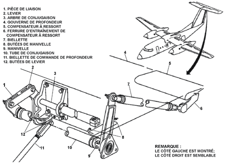 Le circuit de commande de tangage du DHC-8 comprend deux timoneries de câble de commande de profondeur qui commandent chacune une gouverne de profondeur munie d'un compensateur à ressort qui est montée indépendamment de l'autre profondeur. Chaque profondeur possède un compensateur à ressort du côté intérieur et un volet compensateur du côté extérieur. La gouverne de profondeur gauche est commandée par le manche du commandant de bord par l'intermédiaire de la timonerie du câble de commande gauche et du dispositif du compensateur à ressort de la profondeur gauche. La gouverne de profondeur droite est commandée par le manche du copilote au moyen de composants similaires. Les deux manches sont normalement asservis l'un à l'autre, ce qui assure des mouvements simultanés des deux profondeurs, mais un mécanisme d'accouplement permet de découpler les deux manches en cas de blocage de l'une des deux timoneries, et la timonerie qui n'est pas bloquée peut alors fonctionner sur toute sa plage normale.