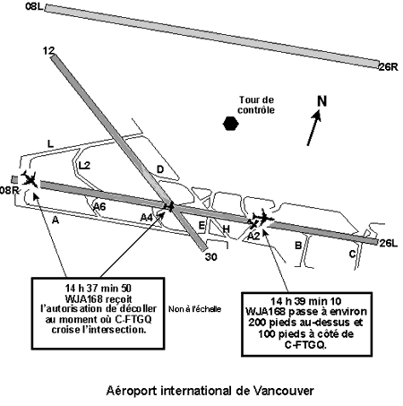 Tout juste après que le Cessna a franchi le seuil, le contrôleur sud de la tour autorise WJA168, qui attend près du seuil, à s'aligner sur la piste 08R. Après avoir vu le Cessna toucher des roues, le contrôleur sud de la tour demande au pilote de quitter la piste vers la droite par la piste 12, située à 4500 pieds du seuil de la piste 08R, et de communiquer avec le contrôle sol de Vancouver. Le pilote a collationné l'instruction correctement. Quelques secondes plus tard, le contrôleur sud de la tour détermine que le Cessna effectue un virage vers la piste 12 et autorise WJA168 à décoller. Cependant, le pilote du Cessna a manqué sa sortie vers la piste 12 et est demeuré sur la piste 08R. Vers 14 h 37, heure normale du Pacifique, alors que WJA168 est en pleine course au décollage, le contrôleur sud de la tour apprend que le Cessna n'a pas dégagé la piste en service. Il ordonne aussitôt au pilote du Cessna de quitter rapidement la piste par la prochaine voie de circulation et de demeurer du côté droit de la piste. WJA168 passe à environ 200 pieds au-dessus du Cessna et à 100 pieds à sa gauche, alors que ce dernier se trouve toujours sur la piste à l'entrée de la voie de circulation A2.