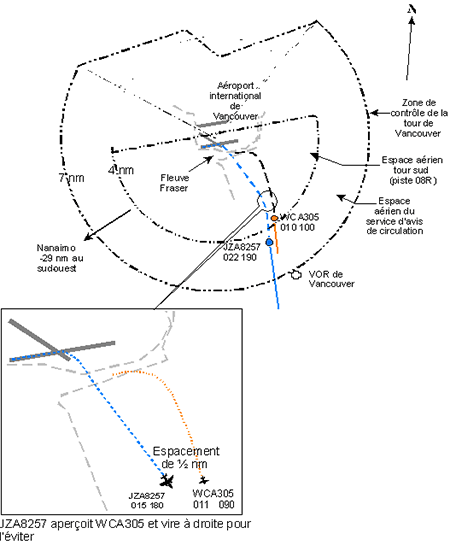 Lorsque le contrôleur sud de la tour a autorisé JZA8257 à décoller du seuil de la piste 08R, il ne lui a pas transmis de renseignements sur la circulation concernant WCA305, car il n'avait pas prévu de conflit. Il se basait sur ses expériences antérieures des trajectoires avec départ depuis l'intersection ainsi que sur les taux de montée prévus. Il prévoyait que JZA8257 se trouverait plus à l'est et bien au-dessus de WCA305, et qu'il n'y aurait aucun conflit. Même si l'équipage de JZA8257 n'a pas demandé d'altitude en route de 2000 pieds, il s'attendait à se voir autoriser à voler à une altitude de 2000 pieds, car une telle autorisation était devenue monnaie courante. C'est cette attente qui l'a amené à réduire de façon importante son taux de montée avant d'atteindre une altitude de 2000 pieds. Le virage anticipé vers le sud et cette réduction du taux de montée ont donné lieu au conflit avec WCA305, tandis que les deux avions volaient selon les trajectoires de départ qui leur avaient été assignées.